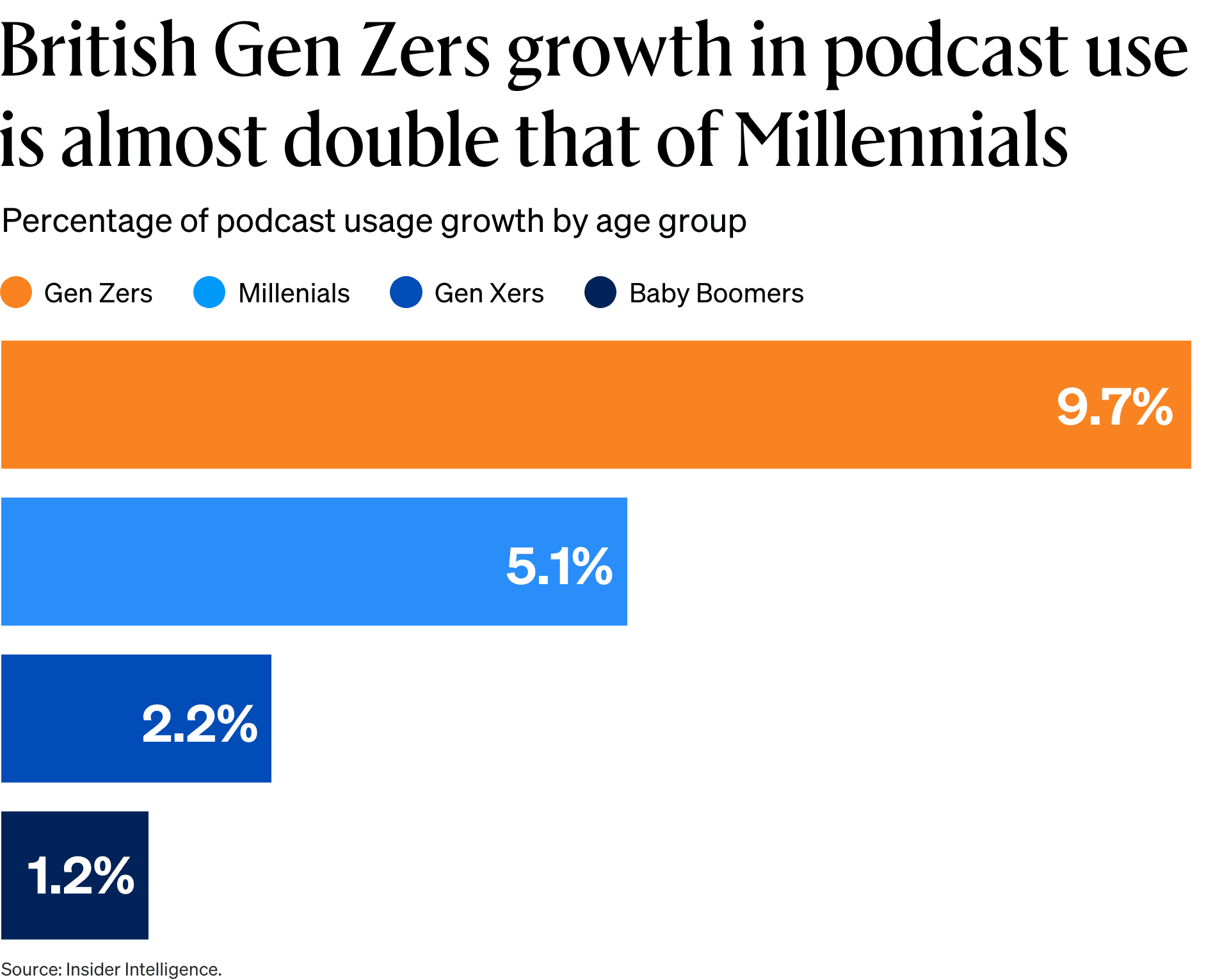 That’s according to research from Insider Intelligence, which says British Gen Zers’ podcast usage is set to grow 9.7 percent in 2023. That figure is close to double millennials’ anticipated podcast usage growth for 2023, which is projected at 5.1 percent. Meanwhile, Gen X and baby boomers are set to register 2.2 percent and 1.2 percent growth, respectively.