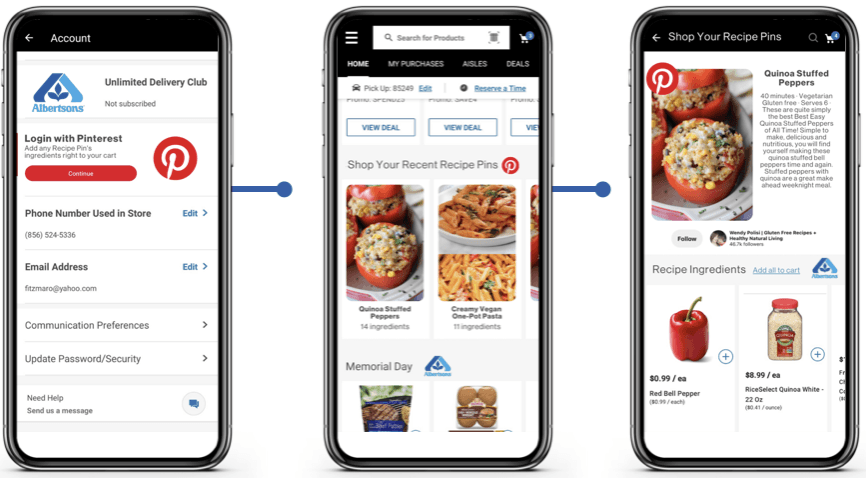Through a new meal planning API, shoppers will be able to connect their Pinterest account to the Albertsons app and then see all the recipe pins they’ve saved from the social platform. They will be able to choose the ingredients from their pins and add them to their virtual shopping basket. The software will also use artificial intelligence to make breakfast, lunch or dinner suggestions based on saved searches, and shopping history. Albertsons also intends to create online “shoppable tablescapes” on Pinterest to inspire shoppers with different recipes.