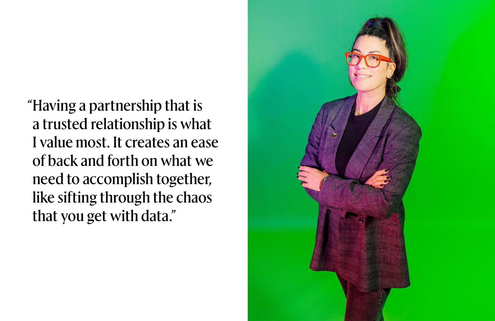 There's so much data out there now. Year over year, it becomes even more fragmented from the different channels, the targeting capabilities, privacy and how you have to reach certain audiences. Having experts at the agency to help comb through all this data is important. Getting a spreadsheet means nothing to me. What is the context around it? Having a partnership that is a trusted relationship is what I value most. It creates an ease of back and forth on what we need to accomplish together, like sifting through the chaos that you get with data.